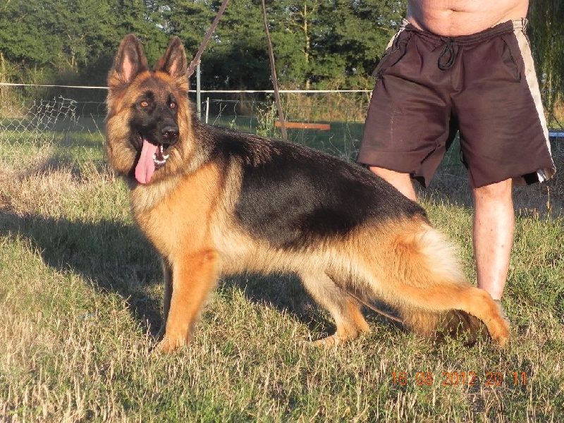 Bon type - bien dans la taille - belle tête - bon ensemble - très bonnes angulations avant et arrière - très bons aplombs - mouvements corrects - poussée + puissante - très bonne fermeté. Ce chien se fait remarquer par une excellente construction !